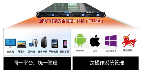 通軟終端安全管理平臺GTMA為用戶提供了完整自主可控、軟硬一體的終端安全管理平臺,易實施、易維護,實現(xiàn)了對設(shè)備、用戶、流量數(shù)據(jù)的安全管控、保障業(yè)務(wù)核心數(shù)據(jù)不外泄,在一個管理平臺上管理臺式機、筆記本、平板電腦、智能手機等泛終端,實現(xiàn)泛終端的統(tǒng)一管理,達到政府用戶信息與網(wǎng)絡(luò)管理“自主、安全、可控”的管理目標,是真正實用、易用的新一代終端安全管理解決方案!