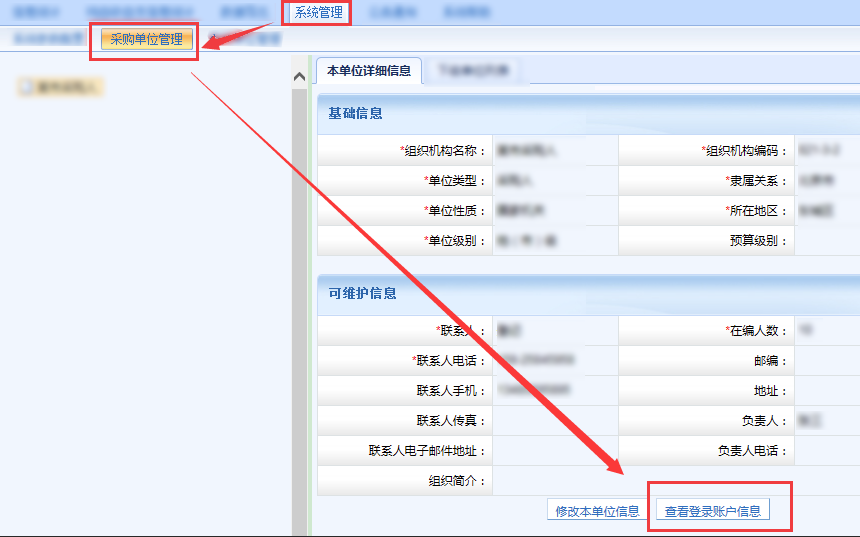 方法一,在左側(cè)組織樹找到下級單位并選中,然后點擊查看登錄賬戶信息。