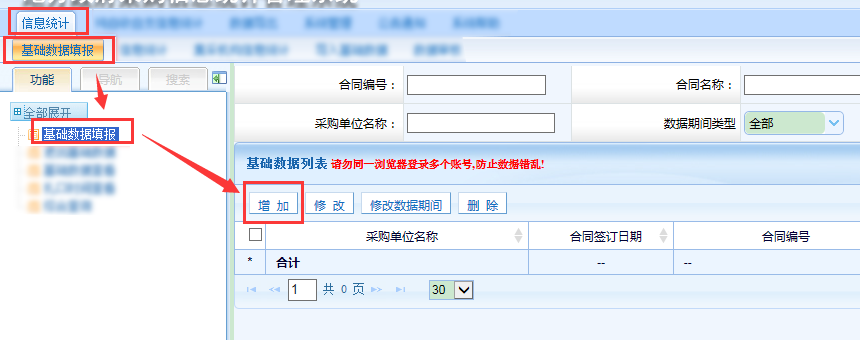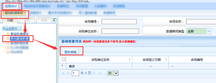 第四步,下級單位上報數(shù)據(jù)后,監(jiān)管單位在其他合同信息統(tǒng)計頁面接受匯總報表。