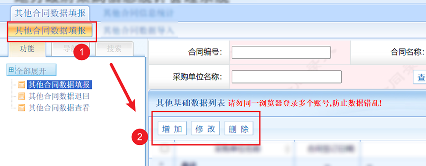 第二步,點擊其他合同數(shù)據(jù)填報進(jìn)行數(shù)據(jù)錄入,由于其他合同只在年末錄入,所以填報時不用選擇數(shù)據(jù)期間,錄入頁面類似普通合同(其他合同不用錄入合同編號與合同名稱)。