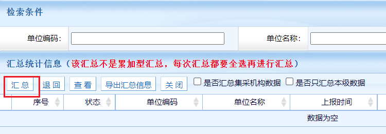 接收數(shù)據(jù)完成后,點擊匯總按鈕,系統(tǒng)彈出匯總頁面,全部勾選數(shù)據(jù)后,點擊匯總按鈕,完成匯總。