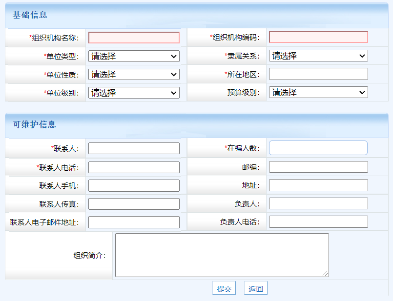 第二步,錄入下級單位信息,其中組織機構(gòu)編碼在系統(tǒng)中唯一,其中單位類型、單位性質(zhì)、單位級別影響系統(tǒng)功能和報表統(tǒng)計,請謹(jǐn)慎選擇。