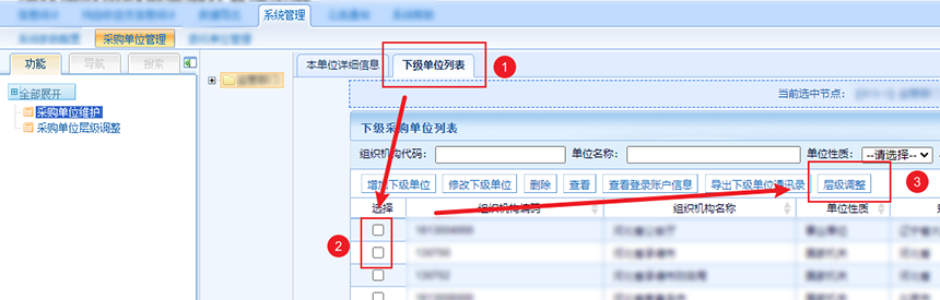 首先,在下級單位列表選擇要遷移的下級單位,然后點擊層級調(diào)整。