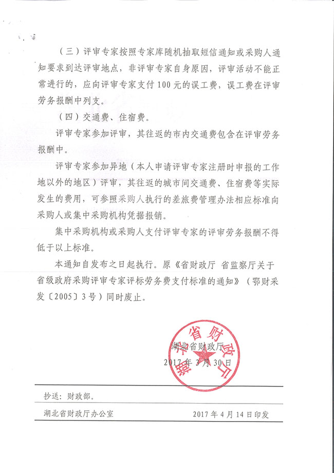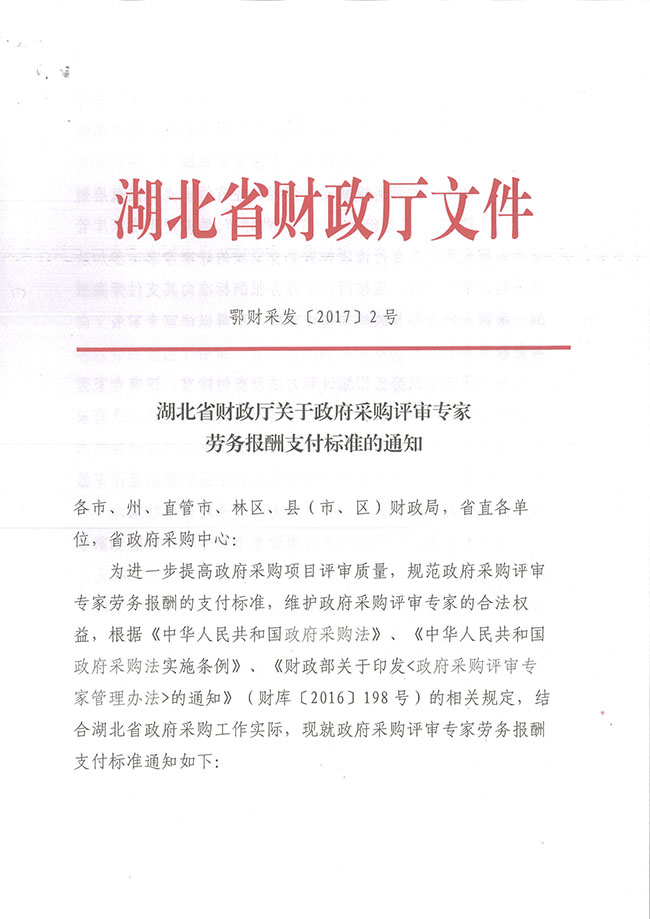 湖北省財政廳關(guān)于政府采購評審專家勞務報酬支付標準的通知