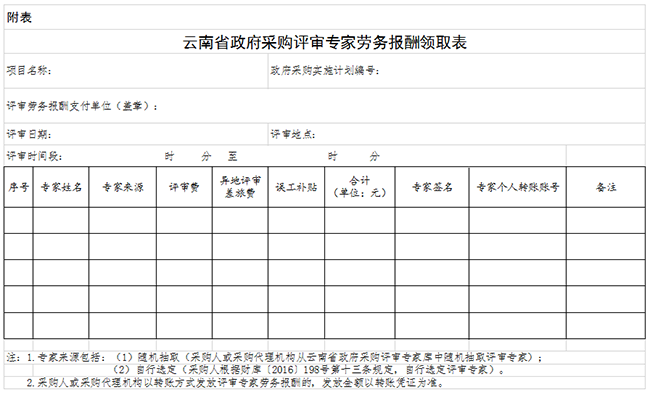 云南省財(cái)政廳關(guān)于印發(fā)《云南省政府采購(gòu)評(píng)審專家勞務(wù)報(bào)酬支付暫行辦法》的通知
